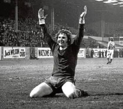 Dons hero and record goalscorer Joe Harper celebrating in front of Pittodrie’s ecstatic Beach End fans…